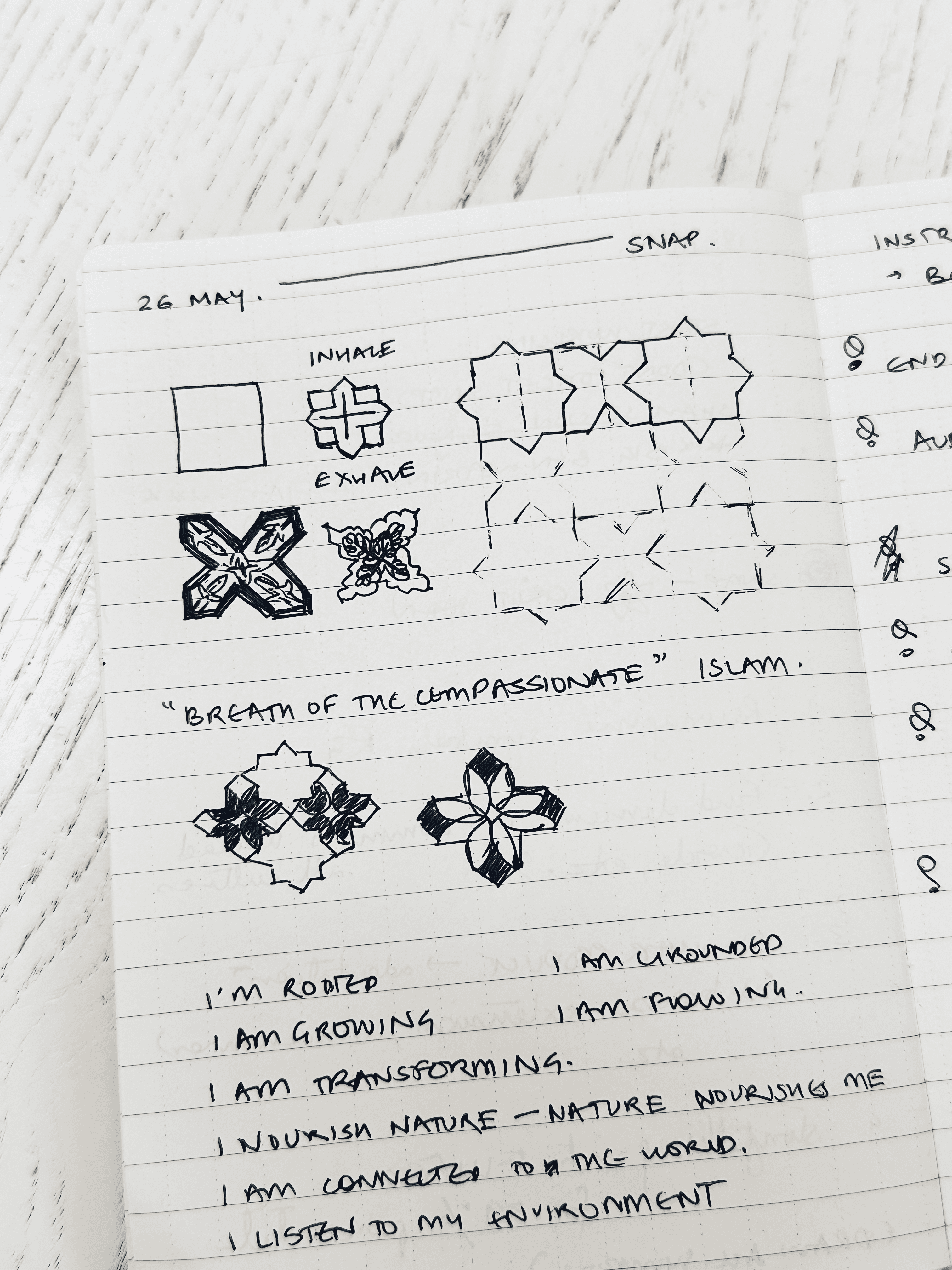 Drawing from the breathing practice of Pranayama (1), Rooted draws attention to the life energy that is contained in our bodies and the control we have over how we release it into the world. The 3D visuals draw from the ‘Breath of the Compassionate’, a geometric pattern symbolising symmetry, harmony and unity. (2)(3)